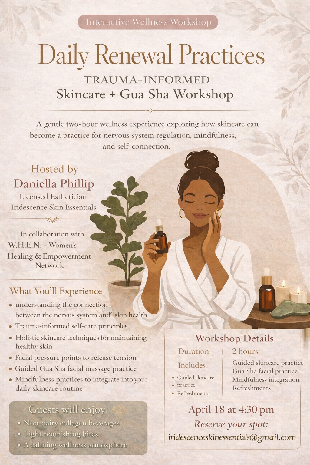 Reserve your spot via email at iridescenceskinessentials@gmail.com